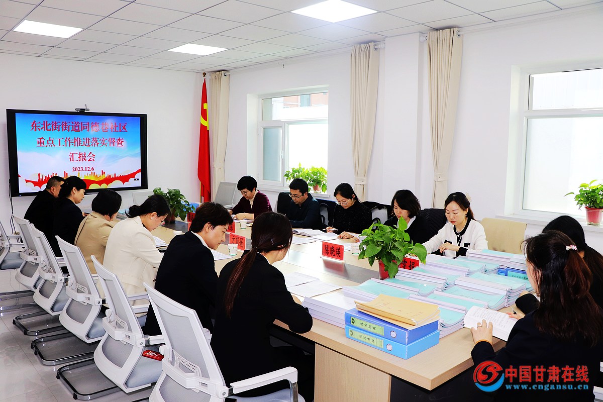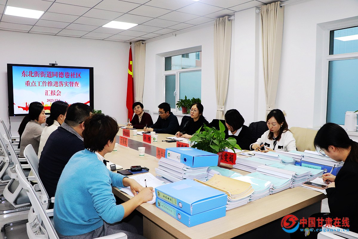 中国甘肃在线肃州讯 12月6日下午,肃州区东北街街道党工委书记带队对同德巷社区重点工作推进落实情况进行督查。督查组通过听取汇报、查阅资料和实地检查的方式进行。