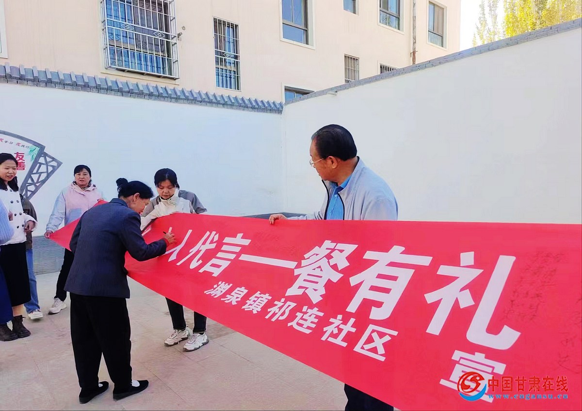 中国甘肃在线瓜州讯 “一粥一饭,当思来处不易;半丝半缕,恒念物力维艰”自古以来中华民族就是一个勤俭节约,艰苦奋斗的民族,但是随着人们的生活水平不断的提高,人们不在受着温饱问题的困扰,铺张浪费似乎成为了惯例。为了让大家继续传承节约粮食的精神,近期瓜州县渊泉镇祁连社区发起“全民学礼、人人代言—餐有礼”为主题的文明倡议实践活动,引导广大群众从饮食做起,落实光盘行动”减少浪费。