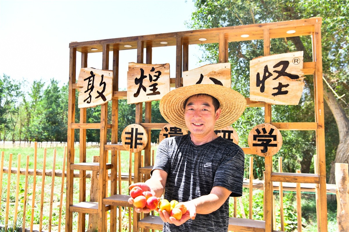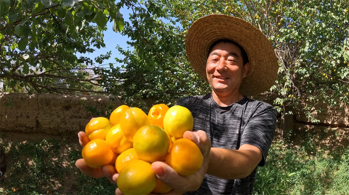 敦煌八怪老字号品牌创始人吴强正在承包的果园里采摘杏子,准备晾干后作为熬制杏皮水、杏皮茶的原料。