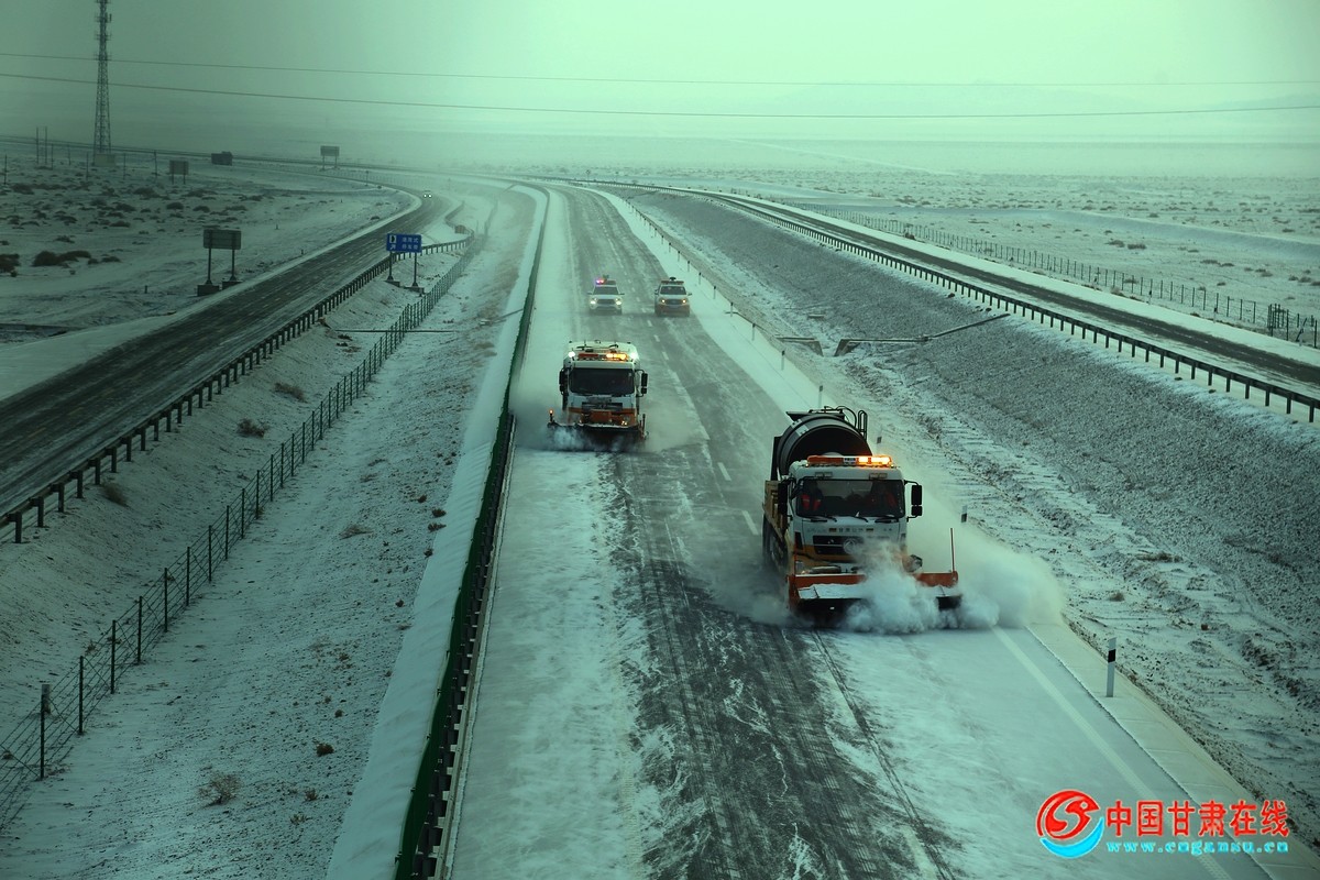 中国甘肃在线敦煌讯 12月10日,甘肃敦煌迎来入冬以来第二场降雪,甘肃省酒泉公路事业发展中心敦煌公路段辖养的国道3011线柳格高速于12月10日凌晨5时许道路出现少量积雪。为防止道路因低温降雪造成路面结冰,增大道路安全隐患,敦煌公路人刻不容缓、闻“雪”而动,第一时间出动多功能除雪车、除雪滚刷、融雪盐撒布车等除雪设备,领导干部带头成立党员突击队,靠前指挥、靠前协调,严格按照省中心“十个务必到位44条工作要点”除雪保畅工作规程,采取随下随清,除雪设备分组分段的作业方式,对路面积雪进行不间断连续清理。