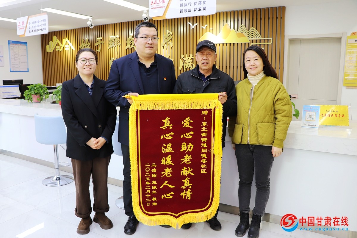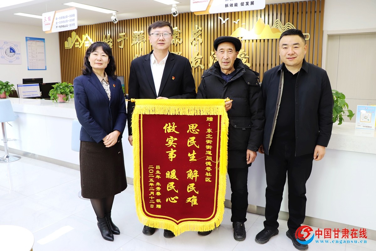 中国甘肃在线肃州讯 2月18日,肃州区东北街街道同德巷社区:居民满怀感激之情,将一面写有“思民生,解民难,做实事,暖民心”的锦旗送到社区工作人员手中,以此表达对社区为群众办实事的诚挚感谢。锦旗上的寥寥数语,却承载着居民们对社区深深的认可与谢意。