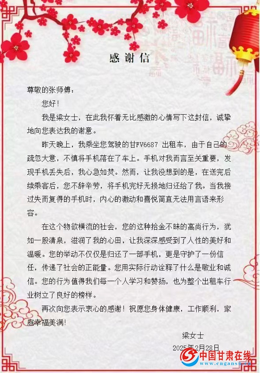 中国甘肃在线敦煌讯 “衷心感谢张师傅帮我寻回手机”。近日,敦煌市全顺出租车服务公司收到了一封感谢信。信中,乘客梁女士对车牌为甘FV6687的出租车驾驶员张刚拾金不昧的高尚行为表示了由衷的谢意。