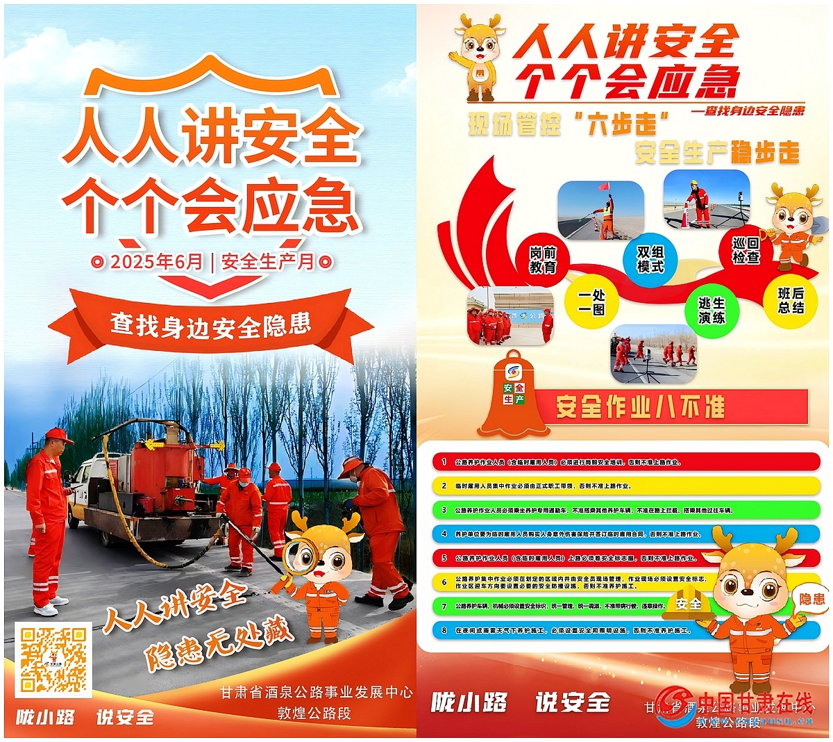中国甘肃在线敦煌讯 在第24个全国“安全生产月”期间,甘肃省酒泉公路事业发展中心敦煌公路段紧扣“人人讲安全、个个会应急——查找身边安全隐患”主题,周密安排、多措并举,扎实开展系列活动,全面筑牢公路养护安全防线。