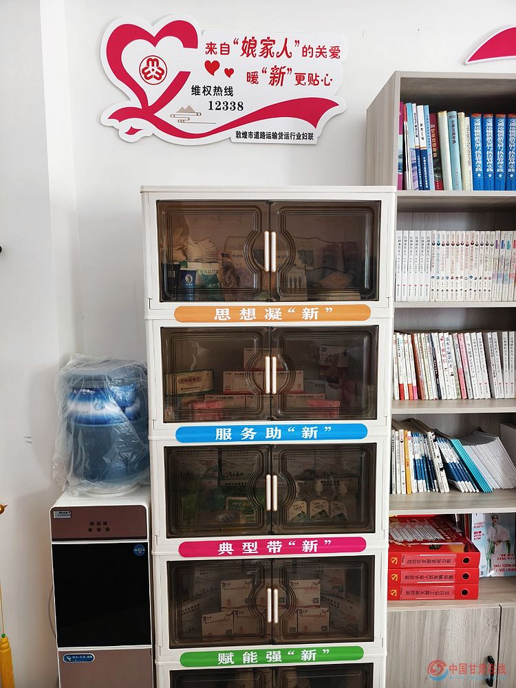 中国甘肃在线敦煌讯 近日,敦煌市道路运输货运行业妇联在敦煌市妇联的支持下,设立了“娘家人暖新角”,为奔波在运输一线的卡嫂、快递员姐妹们提供书籍、茶水、消毒纸巾、雨具、常用药品等暖心物资。这一举措旨在为货运行业女性提供便捷、卫生的公共服务,将贴心的关怀精准送到她们身边。