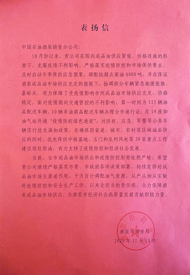 11月10日,酒泉市商务局根据市政府安排向中油甘肃酒泉销售分公司发来表扬信,充分肯定了酒泉分公司在疫情防控和资源紧张时期为全市各项生产经营活动有序开展做出的积极贡献。10月份以来,在国内成品油供应紧张、价格连涨的形式下,酒泉分公司克服疫情不