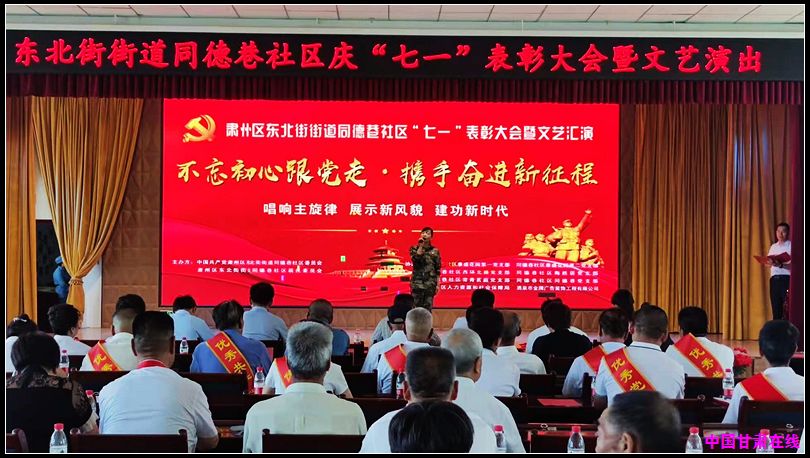 6月26日下午,肃州区东北街街道同德巷社区举办“不忘初心跟党走·携手奋进新征程”“七一”表彰大会暨文艺汇演。辖区广大党员群众欢聚一堂,欢声笑语学党史,载歌载舞颂党恩。文艺演出在舞蹈《红红的灯笼舞起来》中拉开序幕;辖区退役军人表演舞蹈《没有共