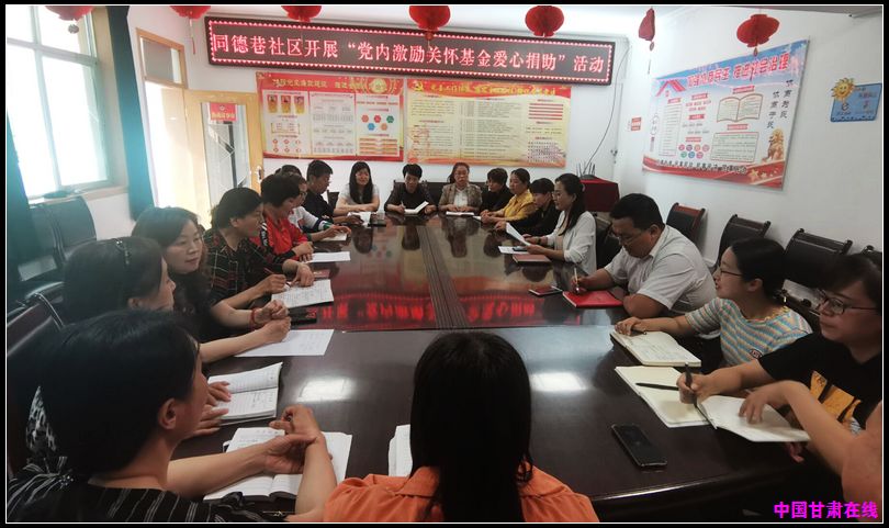 6月7日,肃州区东北街街道同德巷社区开展党内激励关怀基金爱心捐助活动。社区全体党员干部和各党支部书记学习了《关于认真做好6月份“主题党日”活动的通知》文件精神,发出《关于开展爱心捐助筹建“党内激励关怀基金”的倡议》,号召社区广大党员干部积极