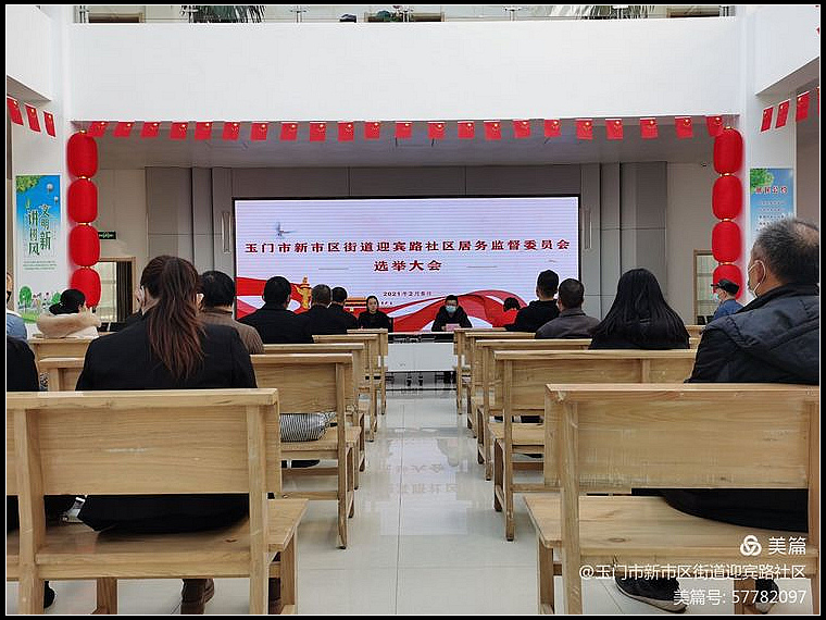 2021年2月5日,酒泉市玉门市新市区街道迎宾路社区召开居民代表大会,选举社区居务监督委员会成员,会议由社区换届选举领导小组成员主持。新市区街道党工委副书记、社区“两委”换届选举工作指导组组长班超同志现场监督指导。根据街道党工委的统一安排,