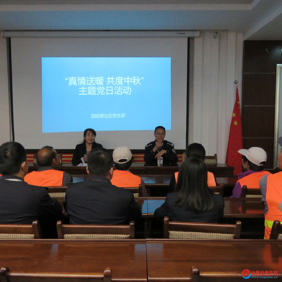 为弘扬中华民族优秀传统文化,全面展示党建领航作用,积极营造文明祥和、团圆和谐的节日气氛,进一步落实党内关怀帮扶机制,深化党内关爱行动,使环卫工人度过一个欢乐祥和的中秋。在中秋节来临之际,团结巷社区党支