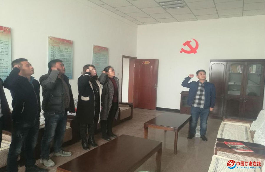 (支部党员在党建办公室重温入党誓词)