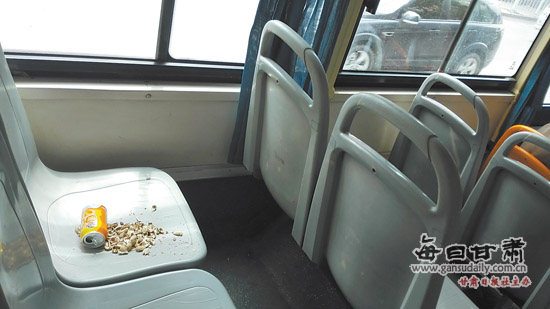 5月27日中午12时许,一辆136路公交车空置的座椅上散落着一大堆花生皮和喝完的饮料瓶,导致刚上车没有座位的乘客议论纷纷。乘客们谴责这种不文明的行为,希望加强公共场所文明监督,共创兰州公交车旅游窗口美好形象。文/图首席记者张鹏翔 记者马成斌