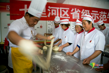 拉面师傅周兴国向精准扶贫建档立卡户讲授牛肉拉面制作技巧。中国青年网记者孙钊摄