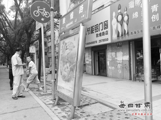 9月21日,兰州晨报记者在敦煌路中段东侧路边看到,一个标着“敦煌路”名称的路牌出现严重倾斜,存在安全隐患。(来源:每日甘肃网)
