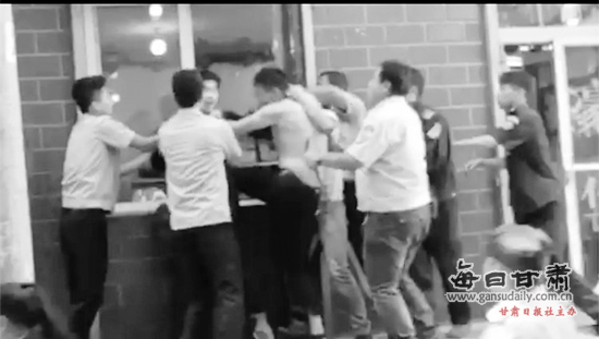 9月21日晚,城管队员脱去上衣“赤膊上阵”殴打商贩的视频在兰州市民的朋友圈内疯传。视频一开始,一青年男子情绪激动、上身赤膊挥舞着拳头试图殴打另外一个青年男子,周围数名身着制服的城管队员正努力阻止赤膊男子。赤膊男子疯了一样,声嘶力竭地吼骂着,先后三次向不远处的男青年进攻,其间一次拽住了被打男青年的头发,挥拳几次击中了男青年。视频中还显示,在现场赤膊男子还与另外一名男青年发生了冲突。最终,也被在场的执法队员拉开。据网友文字介绍,视频中赤膊男子系城管执法队员,在拆除一间浴池招牌时,与浴池老板发生冲突,对浴池两经营者施暴,并威胁道:“今晚下班把你弄死!”