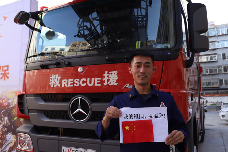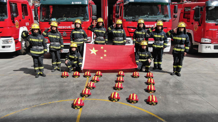 拍摄过程中,指战员们热情、活泼,以训练地、消防车、消防器材为背景,或穿着抢险救援服,或穿着战斗服,摆出“70”字样等方式,用不同的造型与国旗合影,表达消防指战员爱党爱国的初心以及对祖国的深深祝福。