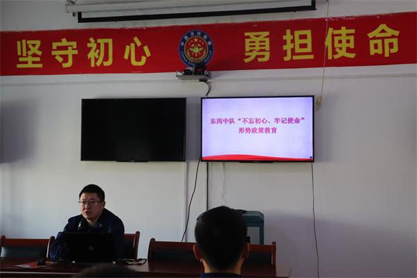 大队要求全体指战员:一是要切实认清当前形势。自觉在思想上、政治上、行动上同以习近平同志为总书记的党中央保持高度一致,把形势政策教育焕发出的政治热情转化为履职尽责的实际行动,做到绝对忠诚、绝对纯洁、绝对可靠。二是要结合“不忘初心、牢记使命”主题教育,深入学习习近平新时代中国特色社会主义思想,强化政治修养和德行操守,砥砺品质意志,增强职业荣誉感,努力做党和人民的忠诚卫士。三是要敢于担当作为。不等不靠,勇当克难攻坚的排头兵,弘扬消防队伍长期形成的过硬作风和优良传统,不忘初心,不负众望,立足应急救援主力军和国家队的历史定位,把党中央和上级党委的关怀转化为工作动力和创新实践,苦练精兵,再立新功。