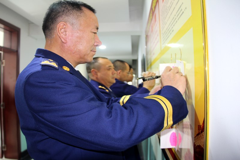 活动中,赵映都副大队长带领全体党员重温入党誓词,党员佩戴党徽,举起右手、握紧拳头,庄严宣誓,重温入党宣誓时的庄严承诺和坚定决心,牢记共产党员的政治责任和历史使命。大队党委成员率先垂范,带领每名党员回想自己的入党初心,依次郑重地在初心墙上写下了自己的入党初心感言,一句句朴实而真挚的寄语,对自己在未来的生活和工作提出了更高的要求,充分表现了作为一名共产党员的使命感和责任感。