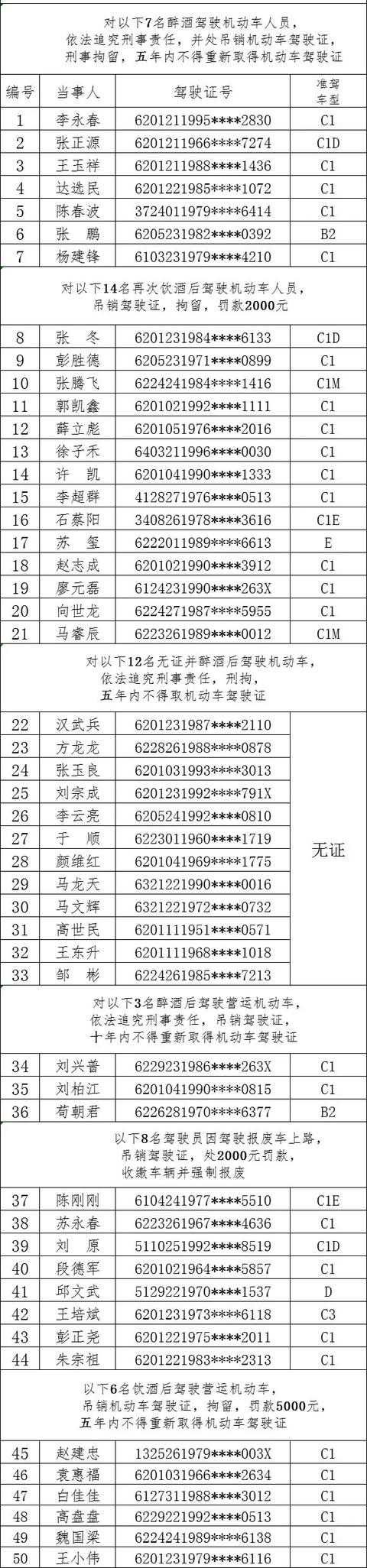 1月12日,兰州交警兰州交警实名曝光50名违法人员,名单如下: