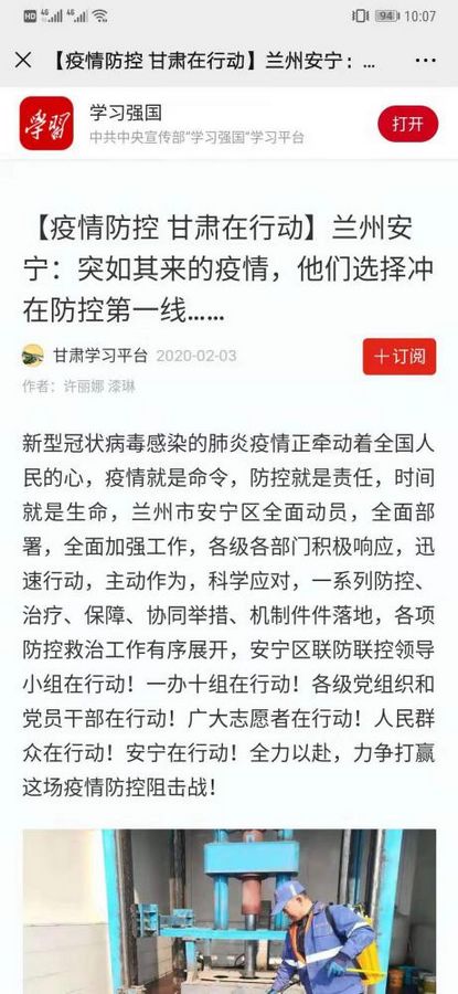 中国甘肃在线兰州讯(赵小春 曹振刚报道)自疫情防控工作开始以来,安宁区全面学习贯彻习近平总书记关于疫情防控工作的一系列重要指示、党中央、国务院和省市区重大决策部署,认真谋划、主动作为,全力做好公益广告、新闻报道、舆情处置等三个宣传工作重点,为打赢疫情防控阻击战斗凝聚力量、鼓舞士气。