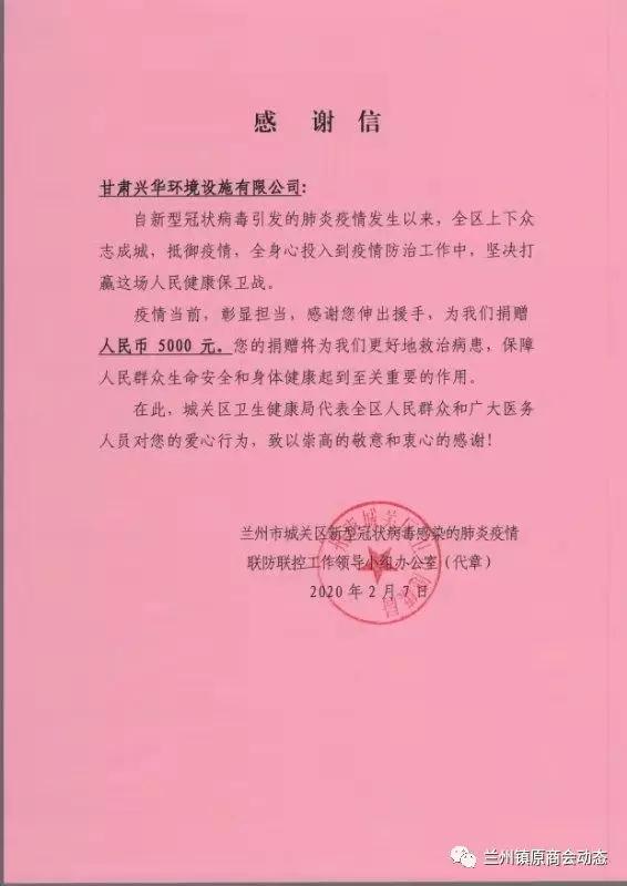 春节以来,新型冠状病毒感染的疫情肆虐而起,向全国各地蔓延,同时也牵动着亿万国人的心。当新型冠状病毒肺炎肆虐楚天大地的时候,兰州镇原商会副会长、甘肃兴华环境设施有限公司董事长李含琦为兰州市城关区新型冠状病毒感染的肺炎疫情联防联控工作领导小组办公室捐款5000元整。