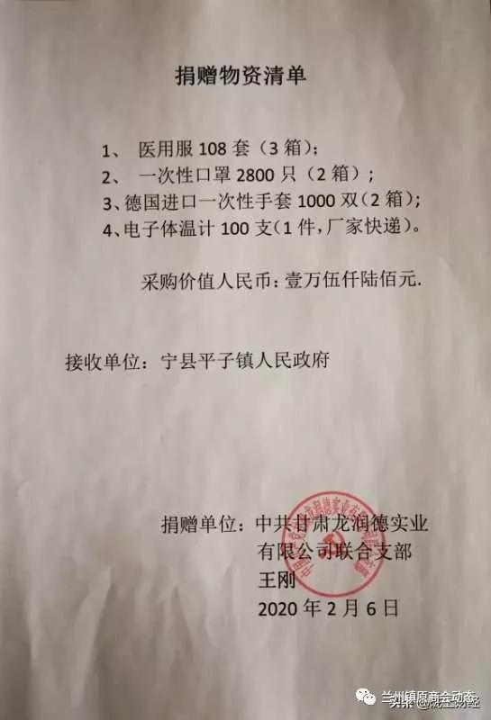 疫情就是命令,防控就是责任。在这场新冠肺炎防疫战打响以来,兰州庆阳商会筹备组发起人之一、兰州镇原商会顾问甘肃龙润德董事长王刚,做为一名共产党员、一名企业的负责人力尽所能,为多部门捐款捐物,做为一名农民的儿子更是没有忘记家乡的父老乡亲,通过快递公司为养育他的家乡——庆阳市宁县平子镇人民政府捐赠一批防控物资:医用服108套(3箱), 一次性口罩2800只(2箱),德国进口一次性手套1000双(2箱),电子体温计100支(1件)。希望家乡的父老乡亲都能平安。
