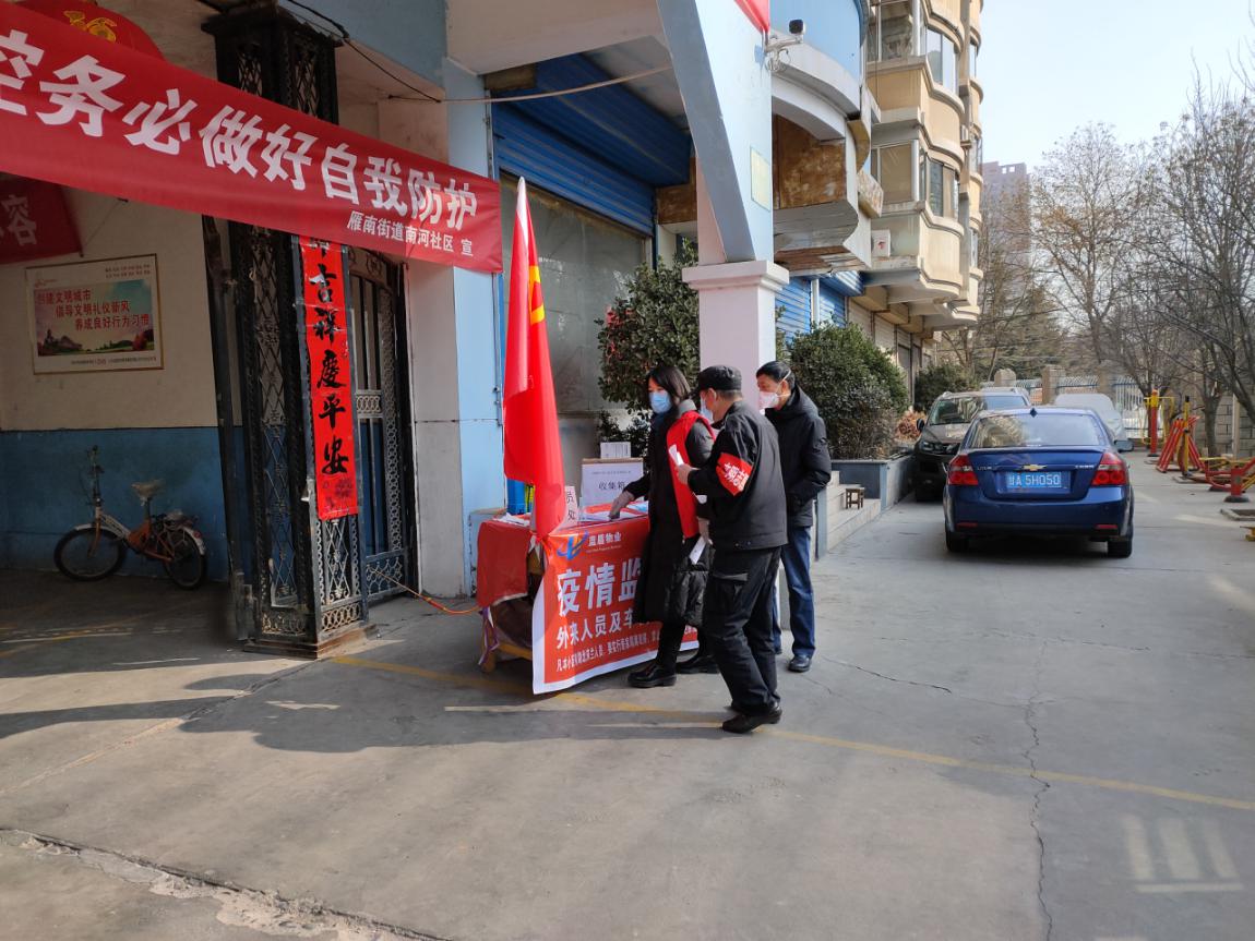 中国甘肃在线兰州讯(赵小春 王银报道)面临新型冠状病毒感染的肺炎疫情防控的严峻形势,雁南街道南河社区充分发挥基层党组织的战斗堡垒作用和党员先锋模范作用,运用“党员突击队+网格员+物业”的方式方法,整合辖区资源,对已下沉工作力量(对已下沉的街道干部,区建设局干部职工),发挥各自所长,按区委区政府、街道党工委办事处部署安排扎实开展工作,落实各项抗击疫情防控各项工作,牢牢守住防控战线的“最后一公里”。