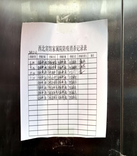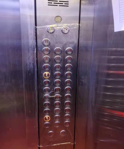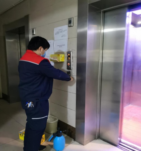 第一时间开展细心防护手段。为预防在电梯这种人流量较大区域交叉感染,工作人员专门放置了按键一次性抽纸并在电梯按键上贴上保鲜膜较大程度减少交叉感染几率。每天有专门工作人员为电梯进行定时消毒,进行消毒登记。