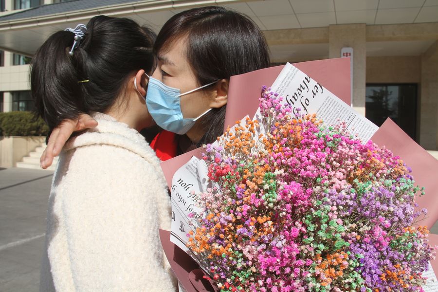 在出征仪式现场,42岁的护师张晓玲和今年即将参加中考的女儿相拥告别,不停的叮嘱女儿,妈妈走后要好好学习,不要耽误了功课。“这段时间我就做好了要去武汉的心理准备,也安排好了家里的事情,最近工作之余时刻关注武汉的疫情,心里很难受,国家有难,我相信我的选择是对的……”张晓玲对记者说。