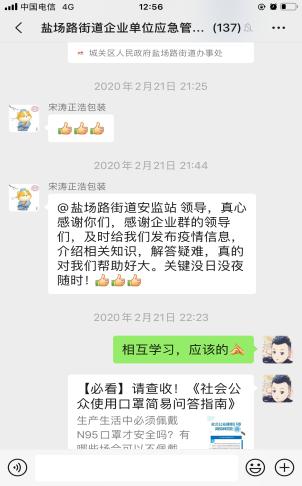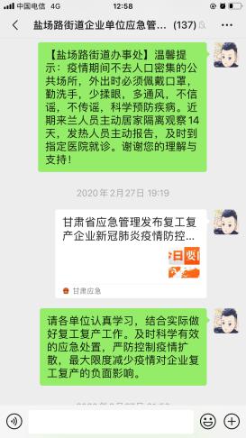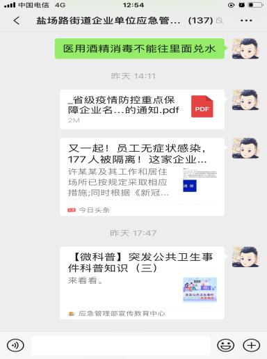 自疫病防控以来,街道应急管理所采用线上培训的方式,将国务院联防联控机制印发的《企事业单位复工复产疫情防控措施指南》以及安全培训课程发布在街道公众号上,同时建立企业负责人微信群以及社区(村)疫情复工复查指导群,不定时地向微信群内发布“什么是新型冠状病毒肺炎”、“疫情返工注意事项”、“消毒液如何配比”、“企业复工防疫十项导则、如何做好预防免感染”等与现阶段疫情防控下安全生产密切联系课程。旨在通过不见面、不聚集方式,在疫情防控期间免费为全街复工企业提供从业人员线上安全培训服务,保障企业安全生产。同时,街道应急管理所还重点将市、区及街道相关部门关于做好相关防护隔离工作的要求及《一周事故警示教育》发布工作群中,要求时刻关注企业员工的身体状况,做好每日进企量体温、戴口罩等习惯,并且开展企业内部隐患自查自纠工作,切实消除隐患。