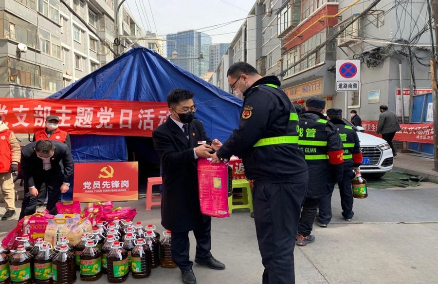 招商银行党支部志愿者们心系战“疫”一线工作人员,开展“送温暖、献爱心”志愿服务活动。招商银行魏经理说:“他们耐心地向防疫点社区居民宣传“讲文明、讲卫生、讲科学”的健康生活方式,倡导群众戴口罩、勤洗手、不聚会、不聚餐、不串门、不扎堆等防疫抗疫知识,对社区外来务工、复工复产人员核查、登记、测量体温等,他们太辛苦了。我们自发组织党员志愿者自愿交纳“特殊党费”为基层社区抗疫一线工作人员送爱心生活用品等方式,做好强信心、暖人心、聚民心工作。也把疫情防控最后一公里工作做好、做实、做到位。”