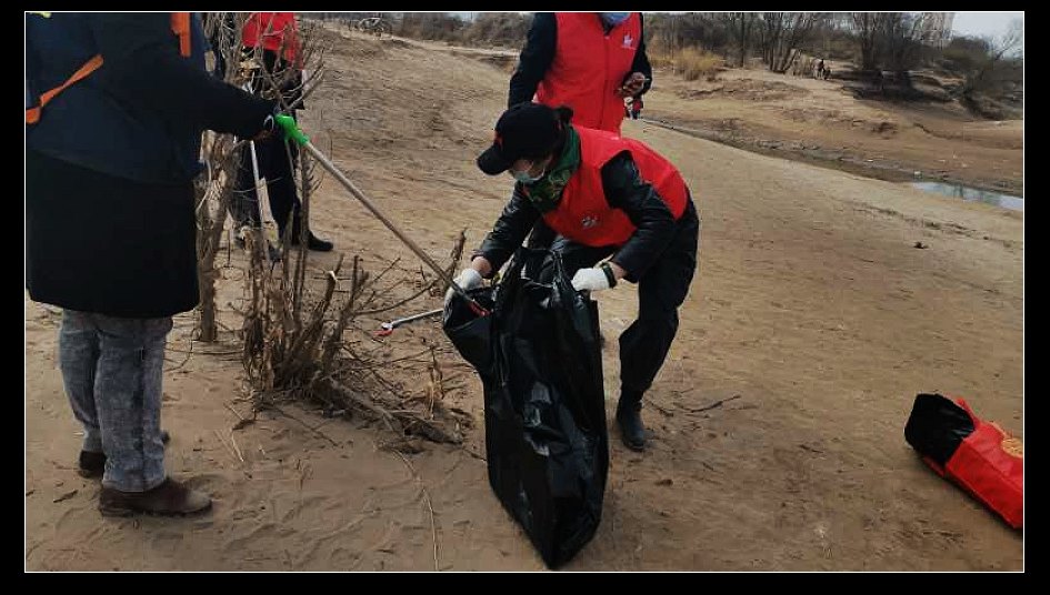 黄河风情线上志愿者们兵分两组,拿着小火钳、塑料袋、扫把等清洁工具,在河岸周边拾捡、清理地面裸露的垃圾以及河流区内的漂浮物。志愿者们一边清理垃圾,一边向过往的路人宣传环保的理念和意义,吸引不少路人都纷纷加入到保护母亲河的志愿活动中来。