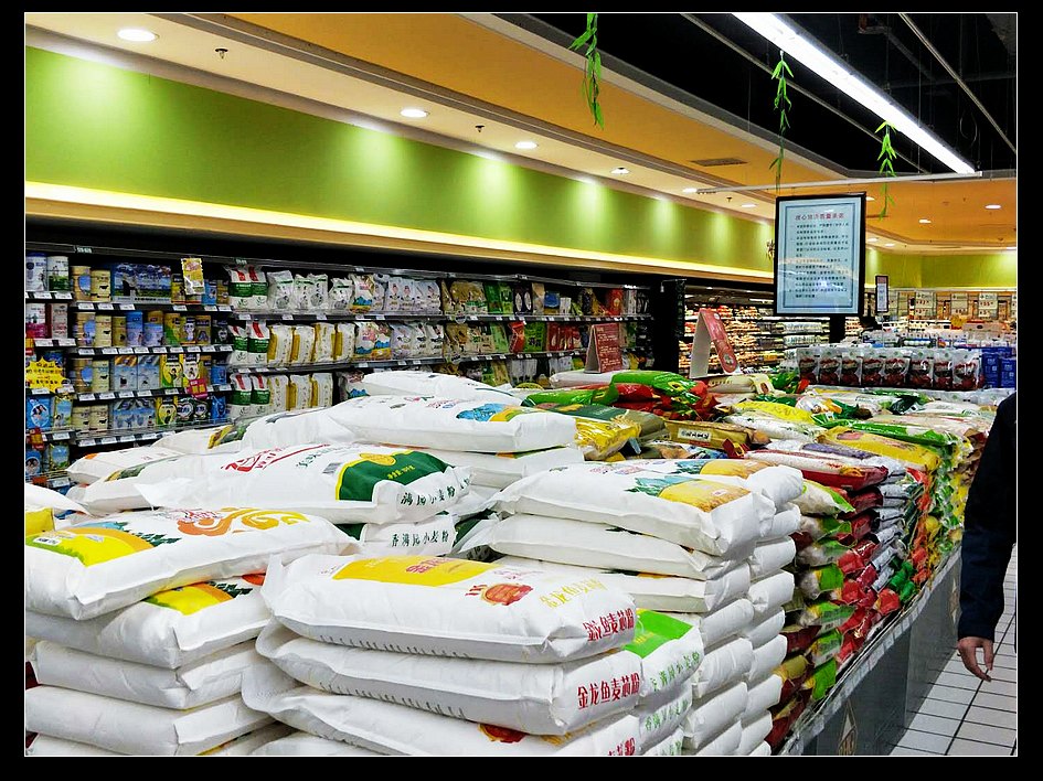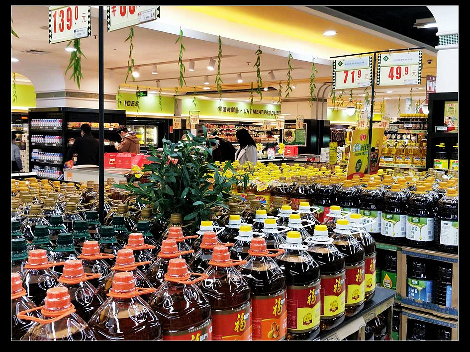 进入超市内,购物车区域设置有已消毒区域,同样有“全副武装”专门人员对购物车进行随时的消杀毒作业。推着购物车,首先进入的是蔬菜区和米面油区域。