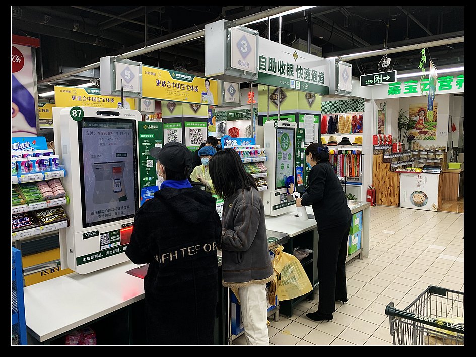 超市共设置有28个收银台,其中四台自助付款机,记者看到,在每个人工收银台旁,顾客的排队距离都保持在一米以上,自助付款机旁也有专门人员对屏幕进行随时消毒。