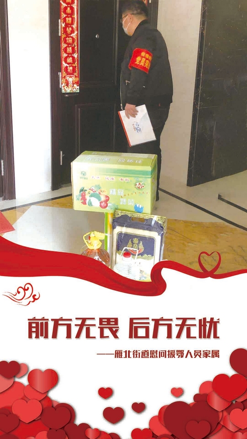 援鄂医务人员用行动诠释医务工作者的使命和职责,他们临危不惧离不开家属的默默付出和支持,作为“最美逆行者”家属,他们既要承担生活的重担,又要忍受思念亲人的煎熬,他们是前线人员坚强的后盾,保护他们是我们的职责,雁北街道将优先做好援鄂人员家属服务保障工作,并为一线的他们说一句:“你们只管征战前线,我们负责守卫后方”。