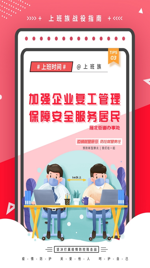 为进一步做好企业复工复产、门店经营管理工作,雁北街道继续落实属地职责,强化企业复工监管,积极落实区委区政府关于企业复工复产各项要求,严格要求企业必须做到“四必须、四达标”,建立“三室一队”,切实保障各项措施落实到位,安全服务于民。