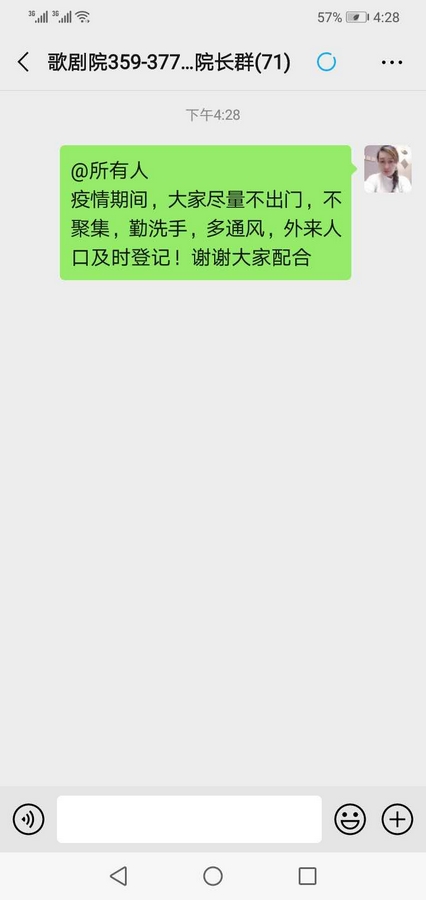在疫情爆发初期,居民对“新冠”病毒肺炎的认识不强,不知道有何症状,导致防控意识不强,甚至有些居民出行都不佩戴口罩。社区针对此种情况,在各个楼院群中发布关于加强肺炎疫情防控的公告,告知居民朋友们关注自己的身体健康状况,勤洗手,多通风,避免去人群密集场所,尤其在春节期间,避免走亲访友,人群聚集。