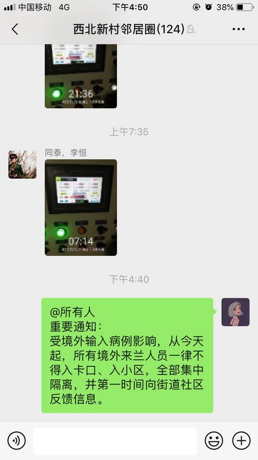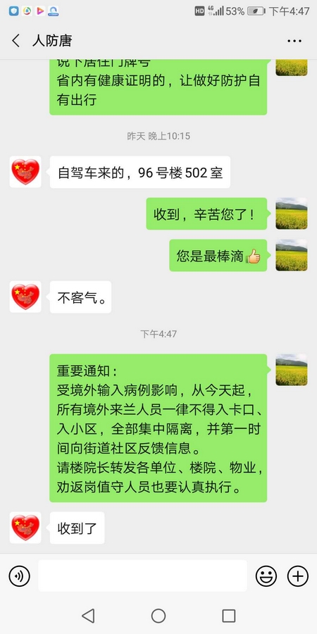 复工复产,是国家的号召,更是人民群众的热切盼望,随之而来的是辖区内外省返兰人员逐渐增多。不仅对社区的疫情防控带来了巨大的考验,更需要辖区居民们的密切配合。居民们在返兰后,都自觉通过“四合院”向楼院长及物业报备自己的返回地、乘坐的交通工具等信息,让有关人员查有可据,能及时掌握他们的动态;同时也很配合社区居家隔离,“宅”在家中,更是做到了相互提醒和监督,邻里间只要回兰,楼院长不出10分钟就会收到院内热心居民的提醒:“楼院长同志,我们院儿里的某某户回来啦!”