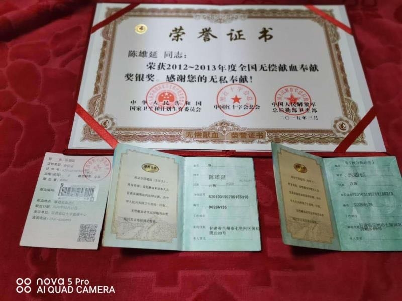 15年前,陈雄延所服役的69221部队,是一支培养出张富清老将军的英雄部队,无论是首长还是战士,张富清精神在他们身上一直传承并发扬光大。回忆19岁第一次献血的经历,他会心地笑道,当时完全没有任何心理准备,甚至还有点紧张害怕,在教导员“每人献出一滴血,将汇成生命海”的谆谆教导和鼓励带动下,完成了第一次献血。直到现在,每年坚持无偿献血一至两次,从未间断,初心不改。