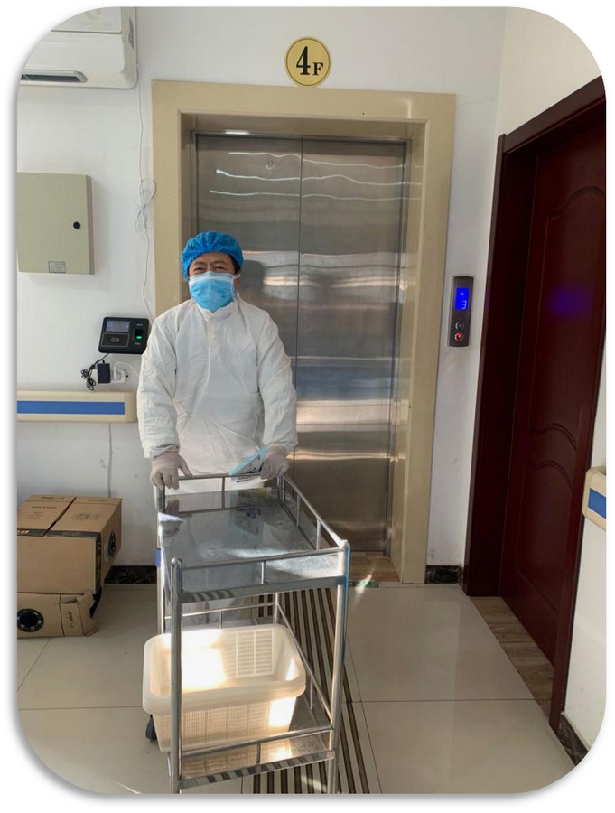 由于是临时药房,设施不足,没有地方洗漱,上厕所也不方便,有些物资易燃易爆,房间每天充斥着刺鼻的消毒水味道,但大家没有怨言,在全程的抗疫工作中,每个人都坚守下来了。为了减轻医护人员的工作强度,药房人员主动承担各楼层送药上门的任务,他们冒着风险,每天穿梭在四个楼层送药,甚至临时药房品种和储备不够时,他们还要去一楼的污染区取药。所有这一切,他们做的无怨无悔,没有一个人后退。