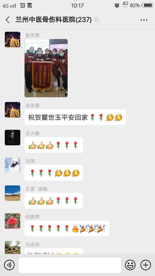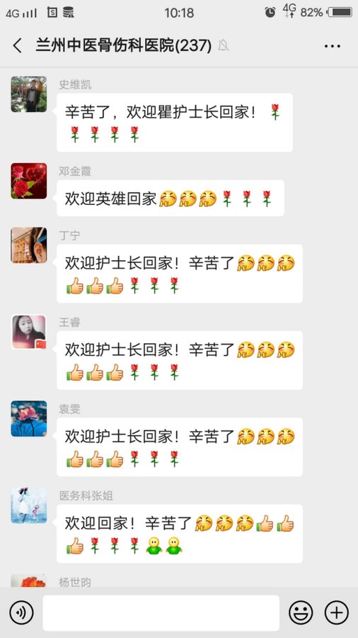 得知她胜利凯旋的消息,医院微信群顿时喧闹起来,“欢迎勇士归来,辛苦了!”、“欢迎回家”、“向抗疫英雄致敬!”