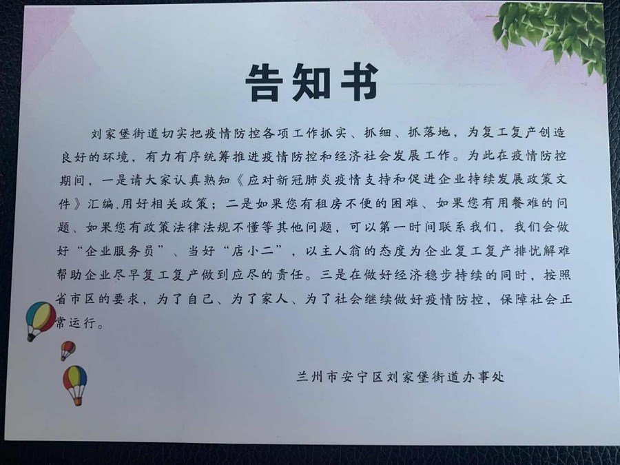 “您好,这是复产复工服务联系卡,如果您有租房不便的困难、有政策法律法规不了解等其他问题,都可以第一时间联系街道社区!”“给您送来一些资料,希望咱们用足用好政策红利,共同推进企业复工复产。”近日,刘家堡街道辖区的不少企业都收到了社区工作人员主动上门送来的《企业复产复工服务联系卡》和《应对新冠肺炎疫情支持和促进企业持续发展政策文件》汇编,此举受到了辖区企业和广大市民的好评和点赞。