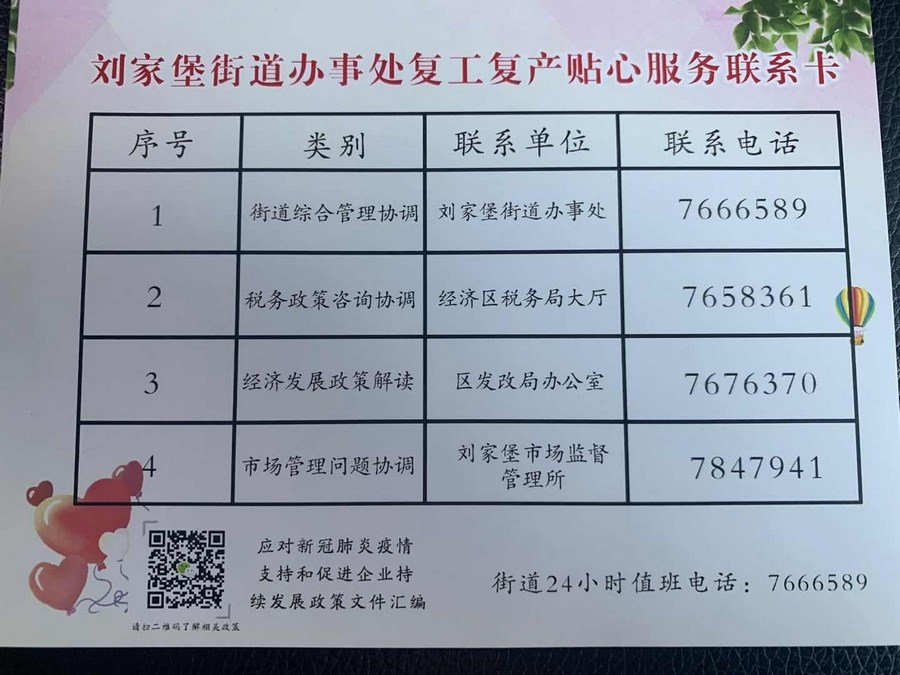 记者走访中看到,贴心服务联系卡上标注了服务类别,主要涉及街道综合管理协调、税务政策咨询协调、经济发展政策解读、市场管理问题协调等内容。为将服务落细落实,卡上还公布了相关职能部门联系电话,企业单位可根据实际情况,就复工复产中出现的困难和问题,第一时间联系街道及相关部门咨询协调、解决问题。街道还将资料汇编整理的电子文档生成二维码,通过扫描了解政策,为企业提供既专业又贴心的政策指导及服务保障。