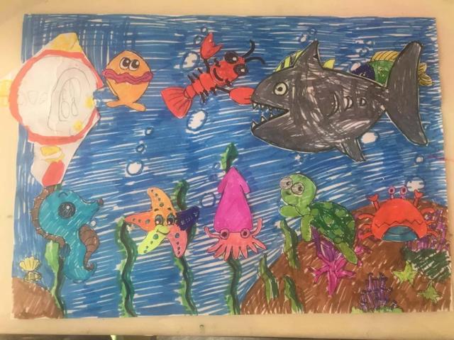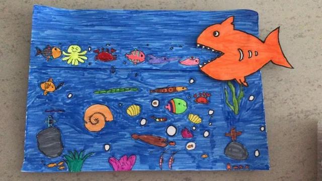 同时也鼓励爷爷奶奶们引导孩子如何用色彩填充图案,“先在纸上画一个鲨鱼的形状,然后将多余部分减掉,完成后另外找一张蓝色的纸作为大海……”视频中老师的剪刀千转百合,一副《海底世界》栩栩如生,跃然纸上。