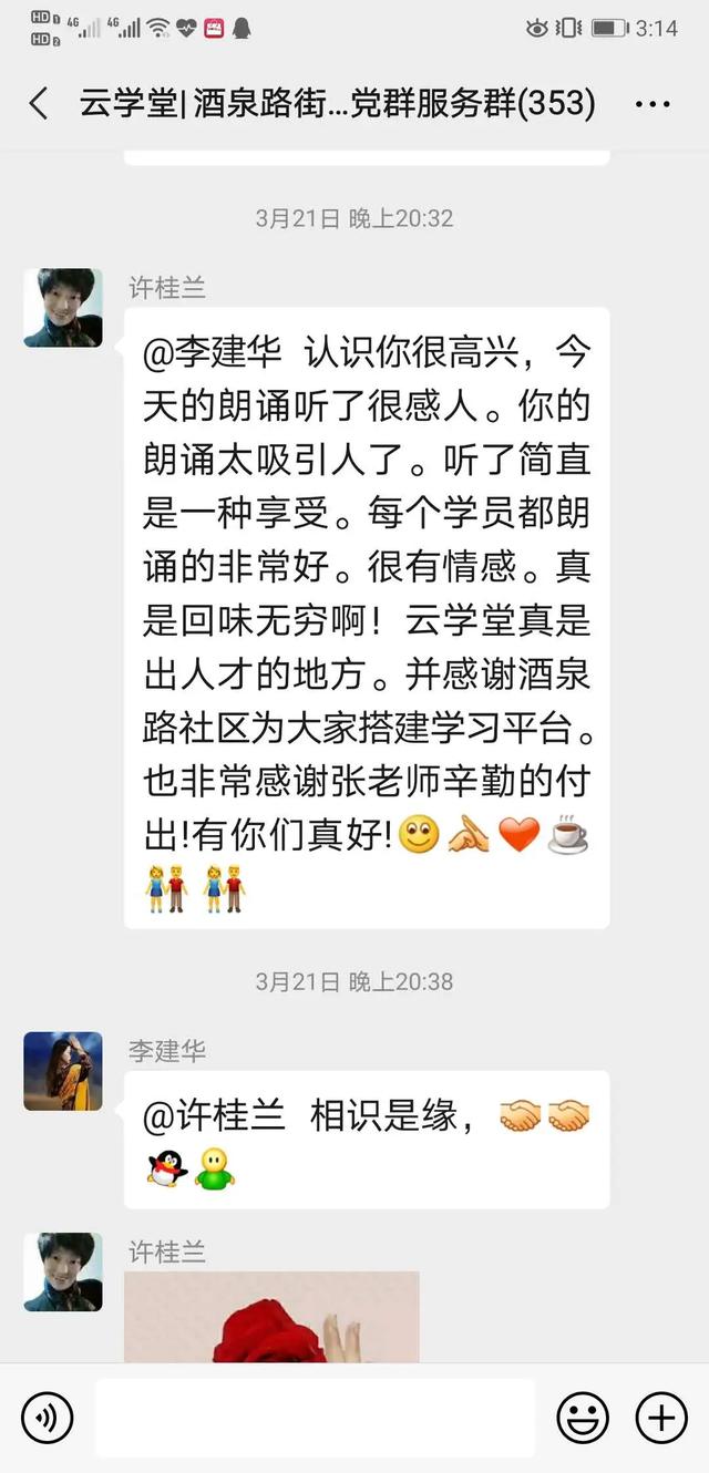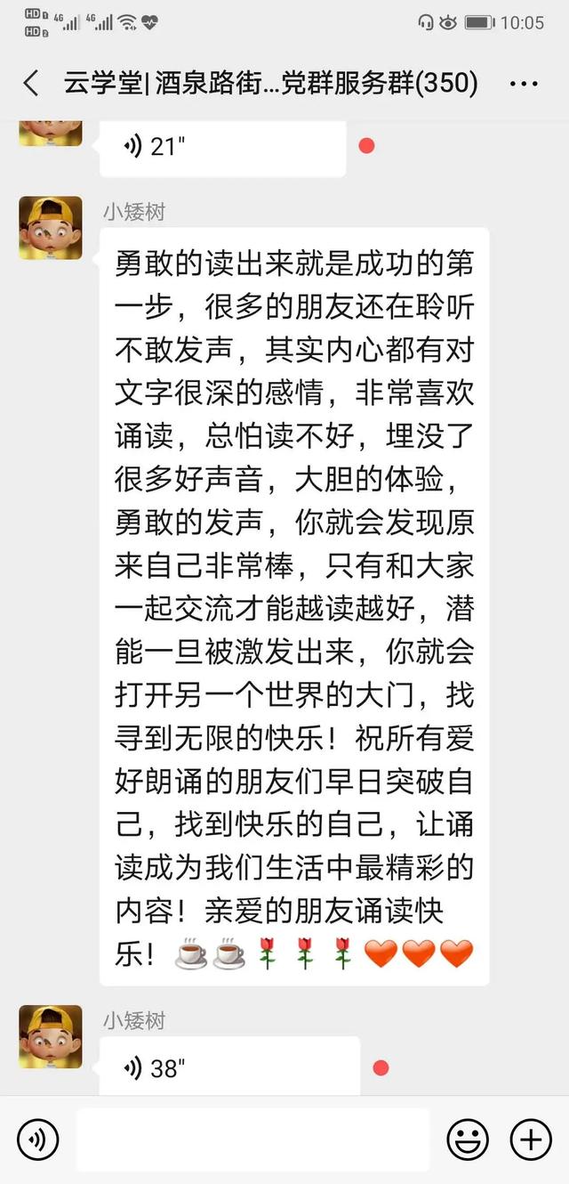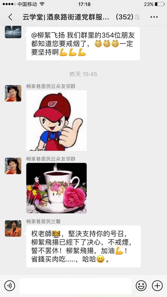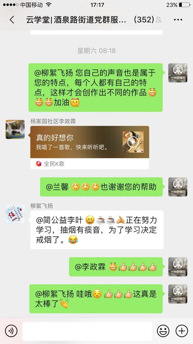 大家的学习热情非常高涨,有一位网名“柳絮飞扬”的学员为了提高自己的朗诵水平,解决烟嗓的问题,甚至决心戒烟。这一举动得到了群内大家的赞同和支持——这居民间的友谊,温暖着大家一起在“云学堂”并肩前行。
