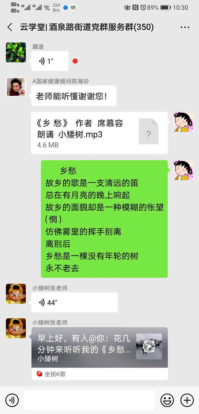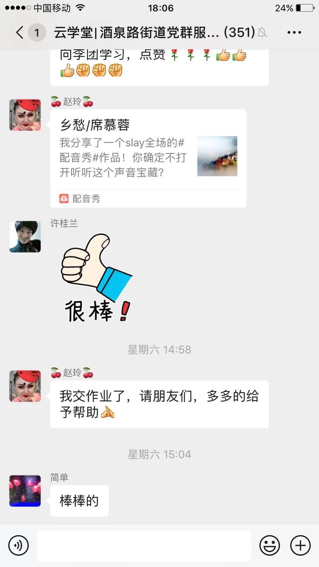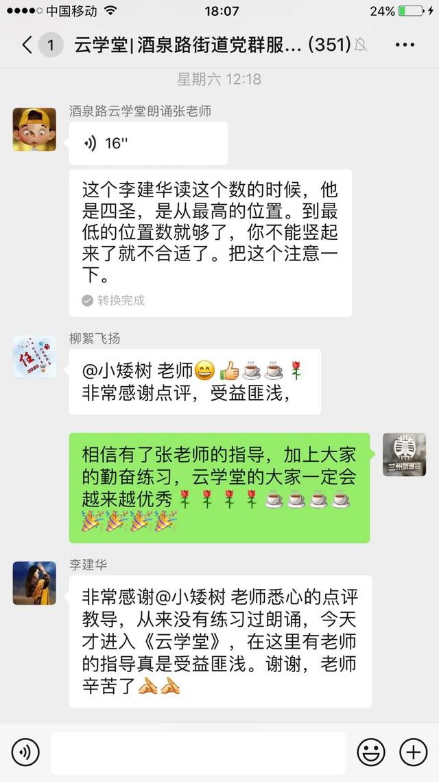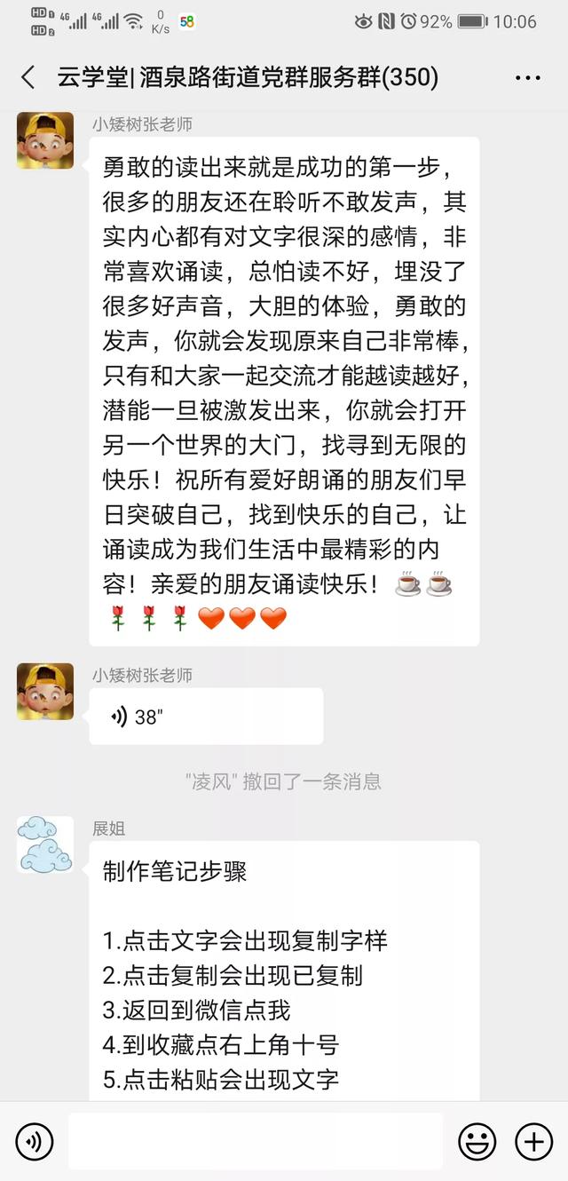 大家的学习热情非常高涨,有一位网名“柳絮飞扬”的学员为了提高自己的朗诵水平,解决烟嗓的问题,甚至决心戒烟。这一举动得到了群内大家的赞同和支持——这居民间的友谊,温暖着大家一起在“云学堂”并肩前行。