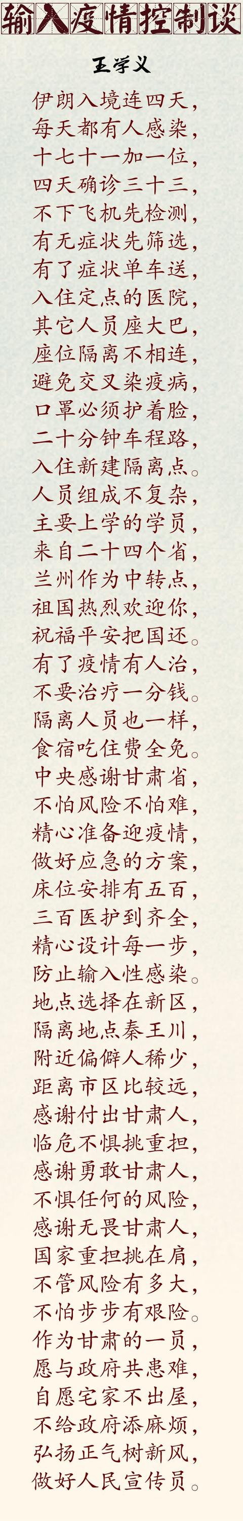 在抗击新冠肺炎疫情的日子里,王学义同志以笔为枪,坚持每天创作写诗。诗作在合唱团及朋友圈中发表,以诗宣传党的政策和抗疫知识,弘扬民族正气和正能量,歌颂白衣天使无私奉献的精神,传递打赢疫情防控阻击战的必胜信心。现连续创作了五十多篇诗歌,他在抗疫期间笔耕不辍,不忘作为一名共产党员的初心,用自己手中的笔和广大党员群众共同奋战,让我们来领略一下他诗作中的风采。