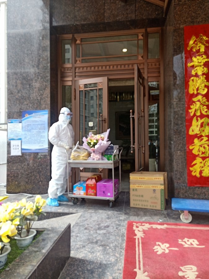 得知他胜利凯旋的消息,皋兰路街道办事处常莉主任、吴平子副主任代表街道第一时间赶到了他目前隔离的酒店,对他进行了慰问,为他送上了鲜花、水果、牛奶、饼干等物资,向他致以崇高的敬意。因为隔离的缘故,我们只能隔着玻璃窗在楼下向英雄挥手致敬,叮嘱他保护好自己,有什么需要第一时间告诉街道,我们永远是他最坚强的后盾。
