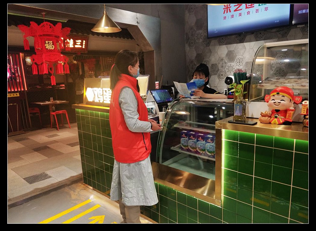 国芳美食城许多餐饮店已恢复正常营业,比起上个月的冷清,近日来享用美食的消费者已经明显增多。结合疫情期间堂食不能达到100%的特殊要求,社区工作人员督促各餐饮门店落实堂食50%和疫情防控两个主体责任,对经营场所全面消毒,对复工员工实行出行登记,坚决做到疫情防控和餐饮服务“两手抓、两不误”。