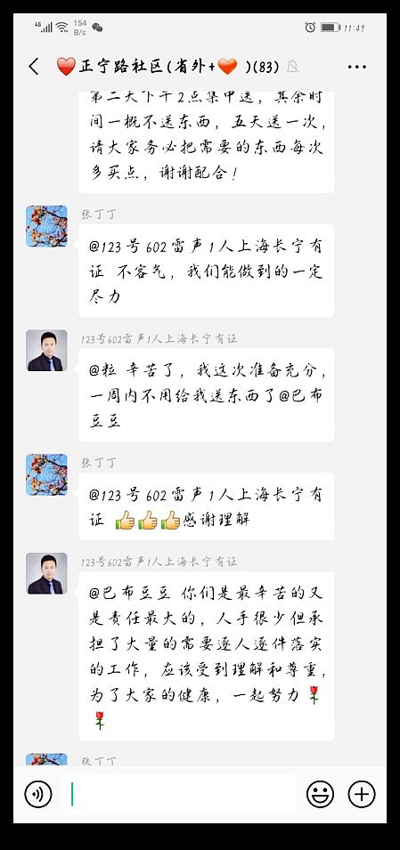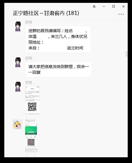 “我的快递和菜在门卫上,麻烦帮我带一下”“麻烦送个体温计”“东西送到了,咱们的工作人员很辛苦、很尽责,非常感谢”“我来自河北邯郸……如需各方面的配合,及时通知我即可,一定配合做好社区防疫工作”……为了方便与来兰返兰人员的沟通协调,为居家隔离人员提供便利,宣传最新的政策消息,正宁路社区分别建立“甘肃省内”和“省外”微信群聊,截止目前群聊人数总计321人。在如此庞大的微信群内,社区的工作人员每天不仅要照顾居民的日常生活,更要疏导居民的心理压力,社区工作者肩负心理辅导员、快递员、送货员、垃圾清理员等不同的角色,坚守“为人民服务”的初心和使命,确保辖区每一位居民身体健康。