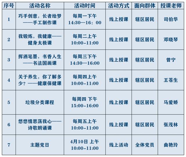 街道依托中心平台,让居民将课堂搬回家。街道党工委依托党群服务中心,推出“书记工作室”“毛大姐调解室”、“领头雁工程”“夜校沙龙”五大系列活动,活动内容包括健身养生、书法绘画、手工制作、美食制作分享等。